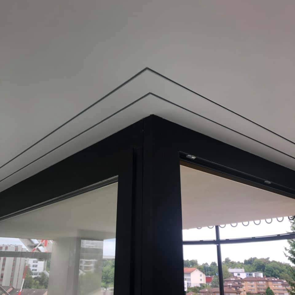 Balkon-Vorhangprofi l mit Deckenträger an Balkondecke aufgesetzt, für Storenstoff e und Blachen.